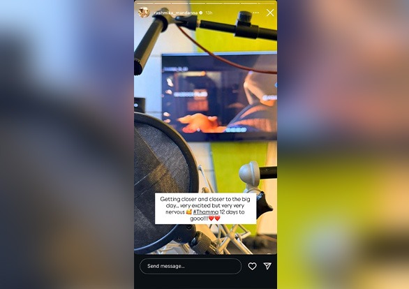 Rashmika Mandanna, fondly celebrated as Pan India’s Queen, just gave fans a heartwarming glimpse into her journey with Thamma. Taking to her Instagram Stories, the actress shared a snapshot from the dubbing studio, with the microphone in focus, a monitor in the backdrop, and her caption brimming with excitement. “Getting closer and closer to the big day… very excited but very very nervous �� #Thamma 12 days to go!!! ❤️❤️,” she wrote. The image beautifully captures the calm before the storm, a superstar putting her final touches on what promises to be another memorable performance.