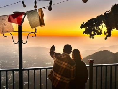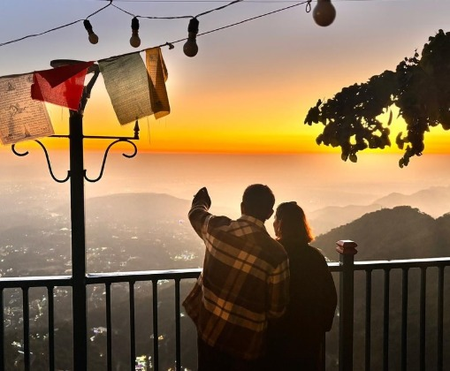 In the images, the couple is seen enjoying a hill vacation, watching beautiful sunsets together. They pose with their backs to the camera, gazing at the mountains and soaking in the serene view.