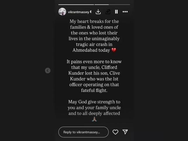 "My heart breaks" is how Vikrant Massey describes his personal loss. With other celebrities, including Shah Rukh Khan, Anushka Sharma, and Aamir Khan, posting condolence messages for the impacted families, the entertainment industry joined the mourning chorus. Actor Vikrant Massey was one of them; he shared his sorrow on Instagram, saying that the tragedy was personal to him. "My heart breaks for the families & loved ones of the ones who lost their lives in the unimaginably tragic air crash in Ahmedabad today. It pains even more to know that my uncle, Clifford Kunder, lost his son, Clive Kunder, who was the 1st officer operating on that fateful flight. May God give strength to you and your family, uncle, and to all deeply affected.”