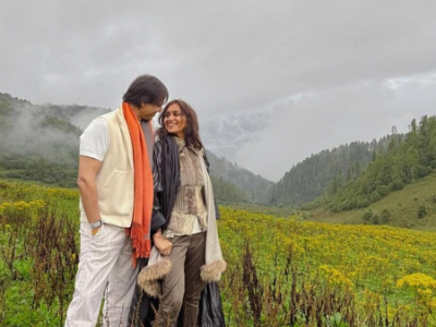 The picture shared by the actor shows Vivek Oberoi and his wife Priyanka standing together in a lush green valley surrounded by mist covered hills and blooming yellow wildflowers..