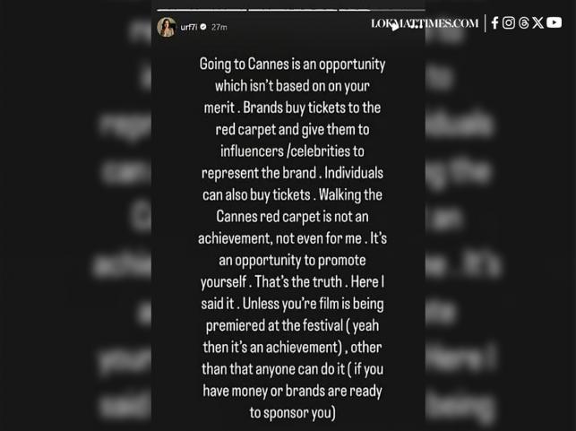 Uorfi's wrote in her insta post, "Going to Cannes is an opportunity which isn't based on on your merit. Brands buy tickets to the red carpet and give them to influencers/celebrities to represent the brand. Individuals can also buy tickets. Walking the Cannes red carpet is not an achievement, not even for me. It's an opportunity to promote yourself. That's the truth. Here I said it. Unless you're film is being premiered at the festival (yeah then it's an achievement), other than that anyone can do it (if you have money or brands are ready to sponsor you)," she added.