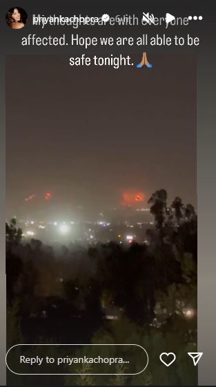 On Wednesday, Priyanka shared a glimpse of the fire on Instagram Story and wrote, "My thoughts are with everyone affected. Hope we are all able to be safe tonight".