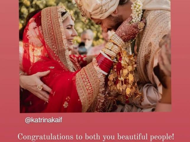 The wedding was a close-knit affair at Rajasthan’s Six Senses Fort Barwara, Sawai Madhopur district, with family and close friends in attendance. As per ANI, the couple took the ‘pheras’ on Thursday afternoon.Katrina looked absolutely stunning in a red lehenga while Vicky was seen donning an ivory white sherwani for the ceremony. Soon, several Bollywood celebs like Priyanka Chopra, Kareena Kapoor Khan, Alia Bhatt, Hrithik Roshan, Tiger Shroff, Samantha Prabhu, Neena Gupta, Abhishek Kapoor, Parineeti Chopra, Janhvi Kapoor, Bipasha Basu and more congratulated the couple in the comment section.