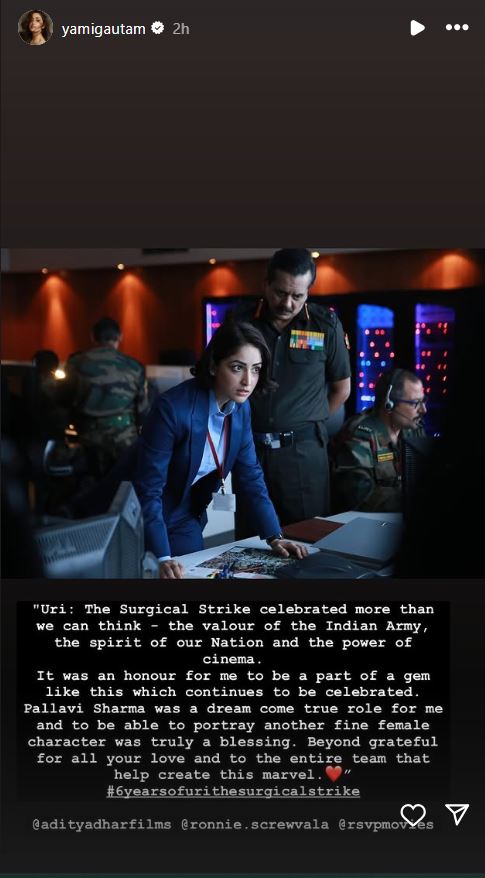 "Uri: The Surgical Strike celebrated more than we can think - the valour of the Indian Army, the spirit of our Nation and the power of cinema. It was an honour for me to be a part of a gem like this which continues to be celebrated. Pallavi Sharma was a dream come true role for me and to be able to portray another fine female character was truly a blessing. Beyond grateful for all your love and to the entire team that help create this marvel. #6yearsofurithesurgicalstrike," she posted.