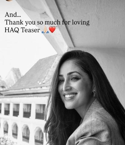 Sharing a monochrome picture of her, she wrote, "And...Thank you so much for loving HAQ Teaser ����❤️" With Haq, the actress once again takes center stage, and the teaser already reflects a performance filled with powerful words and unmatched intensity. Many are calling it a National Award–worthy performance in the making, praising Yami for the way she brings depth and conviction to her role.