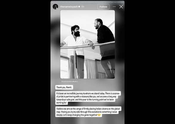 While the excitement for Ramayana is at its peak, producer Namit Malhotra recently shared a heartfelt post for Rocking Star Yash as the actor celebrated his 40th birthday. Responding to the gesture, Yash also expressed his delight to the producer. Taking to his social media, Yash shared a picture with Ramayana producer Namit Malhotra and jotted down the caption: "Thank you, Namit. It's been an incredible journey to where we stand today. There is a sense of pride in partnering with a visionary like you; we've come a long way toward our sole goal, and this year is the turning point we've been working for. I believe we are on the verge of firmly placing Indian cinema on the global map. Having you by my side through this evolution is something I value deeply. Let's keep changing the game together🤝"