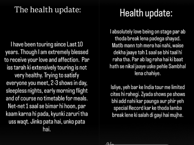 “"I’ve been touring for the last ten years. Though I’m extremely blessed to receive your love and affection, touring this extensively is not good and very healthy. Trying to satisfy everyone you meet, 2-3 shows in a day, sleepless nights, early morning flight, and of course, no timetable for meals. I’ve been unwell for a year, but I had to work because it was important to do at that time,” Khan wrote.