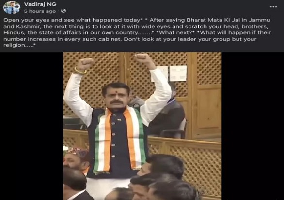 In the viral video, a BJP MLA can be heard chanting "Bharat Mata Ki Jai," followed by footage of MLAs being marshalled out of the assembly. The video is circulating on social media with the caption: "Open your eyes and see what happened today. After saying 'Bharat Mata Ki Jai' in Jammu and Kashmir, the next thing is to watch in disbelief, brothers. What will happen if their numbers increase in every cabinet? Don’t just look at your leader or group, look at your religion."