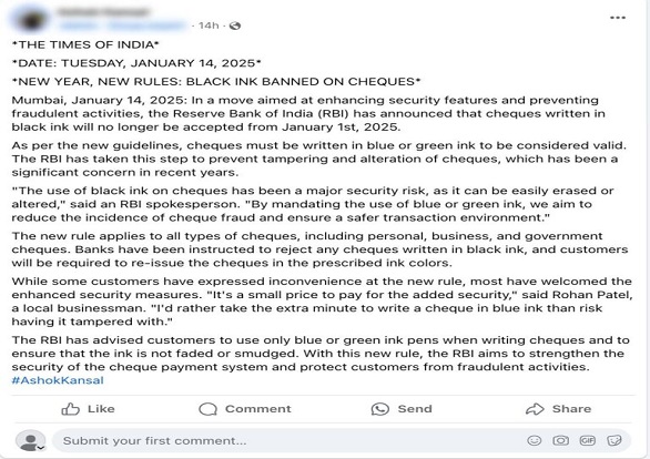 A post is going viral on social media platforms, claims that the Reserve Bank of India (RBI) has changed the guidelines for filling out cheques. The post reads: “According to the new guidelines, cheques written in black ink will no longer be accepted from 01 January 2025, and cheques must be written in blue or green ink to be considered valid. The RBI has taken this step to prevent tampering and alteration of cheques.” The post further alleges that this information was sourced from a report published in The Times of India on 14 January 2025.