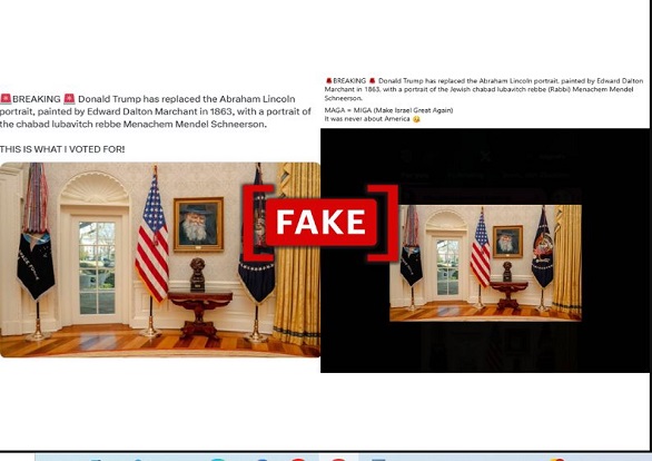 A viral image circulating on social media claims that U.S. President Donald Trump has replaced Abraham Lincoln’s portrait in the Oval Office with one of Jewish leader Rabbi Menachem Mendel Schneerson, also known as the Lubavitcher Rebbe.  He was the seventh leader of the Chabad-Lubavitch movement, a Jewish movement founded in 18th-century Russia.