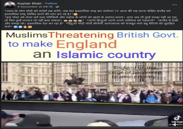 A viral facebook post allegedly depicting a protest is going viral on social media with a claim that it shows Muslims threatening the British government to make England an Islamic country. This article aims to fact-check the validity of this claim.