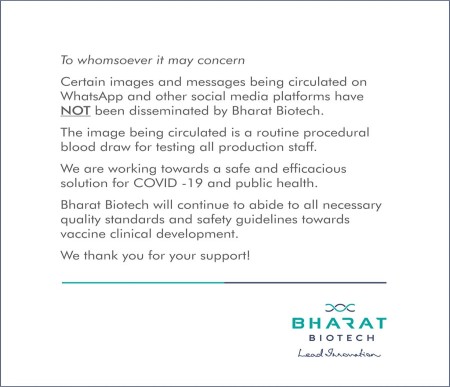 A number of social media users posted the image with the caption, “Dr V. K.Srinivas,Vice President, Bharat biotech, taking Corona vaccine... Clinical trial immediately after taking the first dose he said that he is the first person in India to take vaccine developed by him and his team in Bharat Biotech Look at the confidence that they have in their product.”Soon after the image went viral, Bharat Biotech tweeted, refuting the claim. Part of its rebuttal says, “Certain images and messages being circulated on WhatsApp and other social media platforms have NOT been disseminated by Bharat Biotech. The image being circulated is a routine procedural blood draw for testing all production staff.”