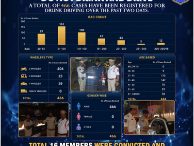 Meanwhile, Hyderabad traffic police said on Sunday that a total of 466 drunk driving cases have been registered over the past two days. Strict enforcement continues across the city to ensure road safety. The majority of cases involve two-wheelers (404). The highest violations were detected in the 21–30 age group.