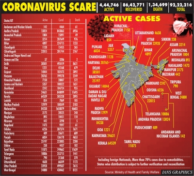 New Delhi, Nov 25 With 44,376 new cases of Covid infections, India's total cases reached 92,22,216 on Wednesday. It is the 18th straight day when India reported less than 50,000 cases in a day.