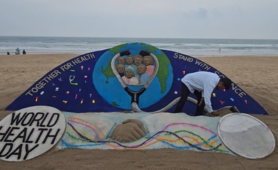 Puri, April 7 Marking World Health Day, renowned sand artist and Padma Shri awardee Sudarsan Pattnaik on Tuesday created a striking sand sculpture at Puri Beach in Odisha, saluting frontline workers and spreading the message, “Together for Health, Stand with Science”.