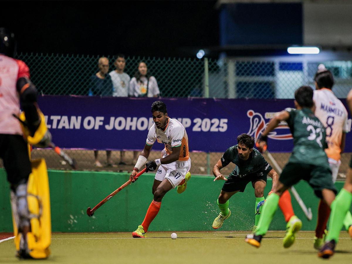 Against the run of play, Pakistan hit back through a quick counterattack and earned a penalty stroke soon after. Captain Hannan Shahid (5') made no mistake, slotting the ball low to the goalkeeper's right to give his team an early lead. Buoyed by the breakthrough, Pakistan began to find their rhythm, stringing together quick passes and launching a few threatening raids into the Indian circle. They came close again through a penalty corner in the 10th minute but failed to extend their advantage, according to a Hockey India release.