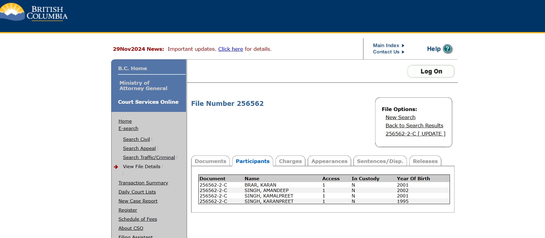 The case documents show 'N' against the status of being in custody. The four men Karan Brar, Karan Singh, Amandeep Singh, Kamalpreet Singh and Karanpreet Singh were charged with the murder of Nijjar and conspiracy to commit murder, by the Canadian Police.