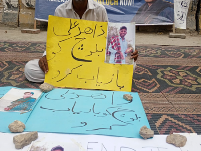 BYC stated that Zahid Ali's family, demanding his safe release, continues to hold the protest despite his father Abdul Hameed's worsening health condition. According to BYC, Ali, 25, a student of Karachi University, was "forcibly disappeared" on July 17.