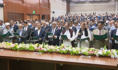 Dhaka, Feb 17 With the Bangladesh Nationalist Party (BNP) set to form the government following its decisive victory in the 13th parliamentary election, the party's elected members of Parliament took the oath of office on Tuesday at the South Plaza of the National Parliament in Dhaka, local media reported.