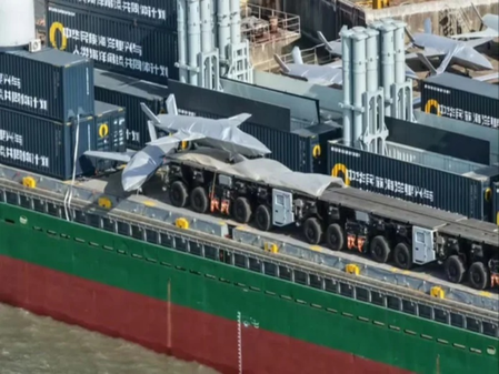 The images circulating online showed a Chinese container vessel at a Shanghai shipyard -- Zhongda 79 -- a 97-metre container ship equipped with containerised vertical launch missile cells, suggesting a modular “arsenal ship” concept that could quickly convert civilian hulls into combat platforms.