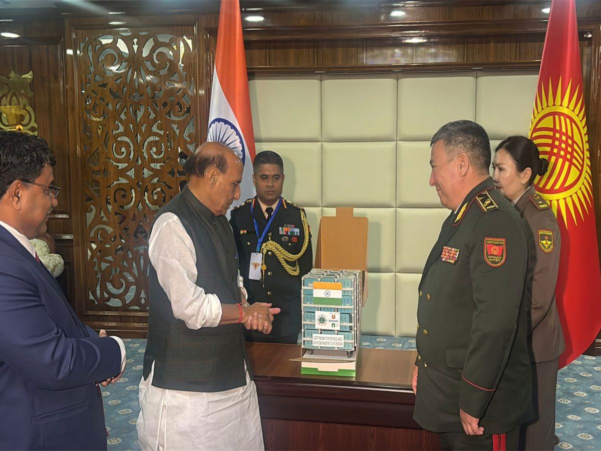 Bishkek [Kyrgyzstan], April 28 : Defence Minister Rajnath Singh on Tuesday gifted two sets of BHISHM Cube modular trauma care systems to his Kyrgyzstan counterpart, Major General Mukambetov Ruslan Mustafaevich, showcasing India's commitment to humanitarian aid.