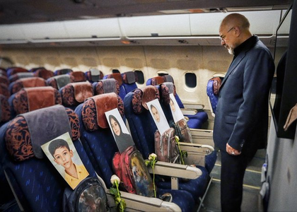 Tehran, April 11 A symbolic image from aboard an aircraft carrying Iran's Parliament Speaker Mohammad Ghalibaf to Islamabad, showing portraits of children killed in the Minab school attack placed on aeroplane seats alongside backpacks and roses.