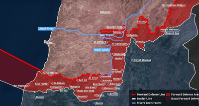 Jerusalem, April 20 Israel's military released a map of a "buffer zone" it is working to establish in southern Lebanon, showing a broad area extending several kilometers inside Lebanese territory and forming a continuous belt from Lebanon's Mediterranean territorial waters to the Mount Hermon area near the Syrian border.
