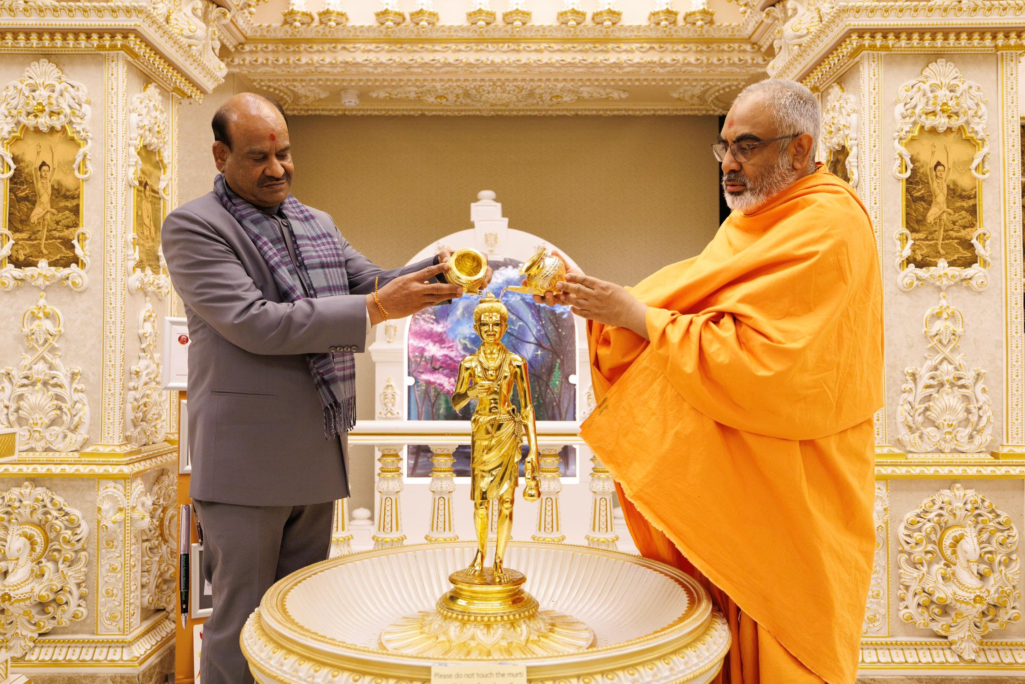 "It was a pleasure to welcome Hon. Shri @ombirlakota, Speaker of the @LokSabhaSectt of India, to #NeasdenTemple this evening. Mr Birla offered prayers during darshan of the murtis, performed abhishek, and gained insights into the impactful work of @BAPS across the UK and Europe, in particular the progress of the upcoming mandir in Paris, France. We deeply value this enriching exchange and look forward to strengthening the bonds between India and the UK."