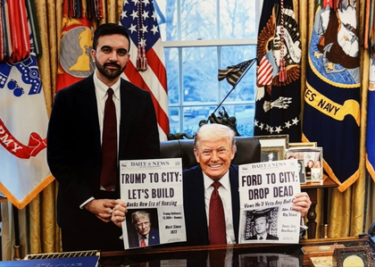 A photograph released by the mayor showed Trump seated behind the Resolute Desk holding two mock New York Daily News front pages. One was an authentic 1975 edition carrying the headline “Ford to City: Drop Dead.” The other was a fabricated page reading “Trump to City: Let’s Build,” crediting the president with backing a “New Era of Housing.”