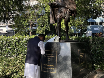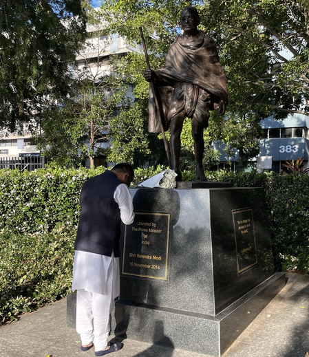 "Honoured to pay a floral tribute at the statue of Mahatma Gandhi at Roma Street Parklands, Brisbane, Australia today. Remembering the Father of the Nation and his timeless message of peace and non-violence," Margherita posted on X.