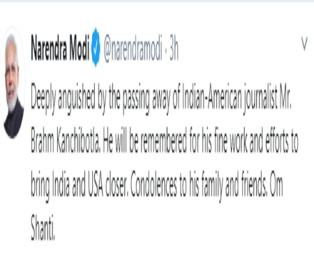 Prime Minister Narendra Modi mourned the death of Indian-American journalist Brahm Kanchibotla who died of the novel Coronavirus in ...