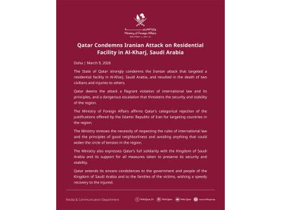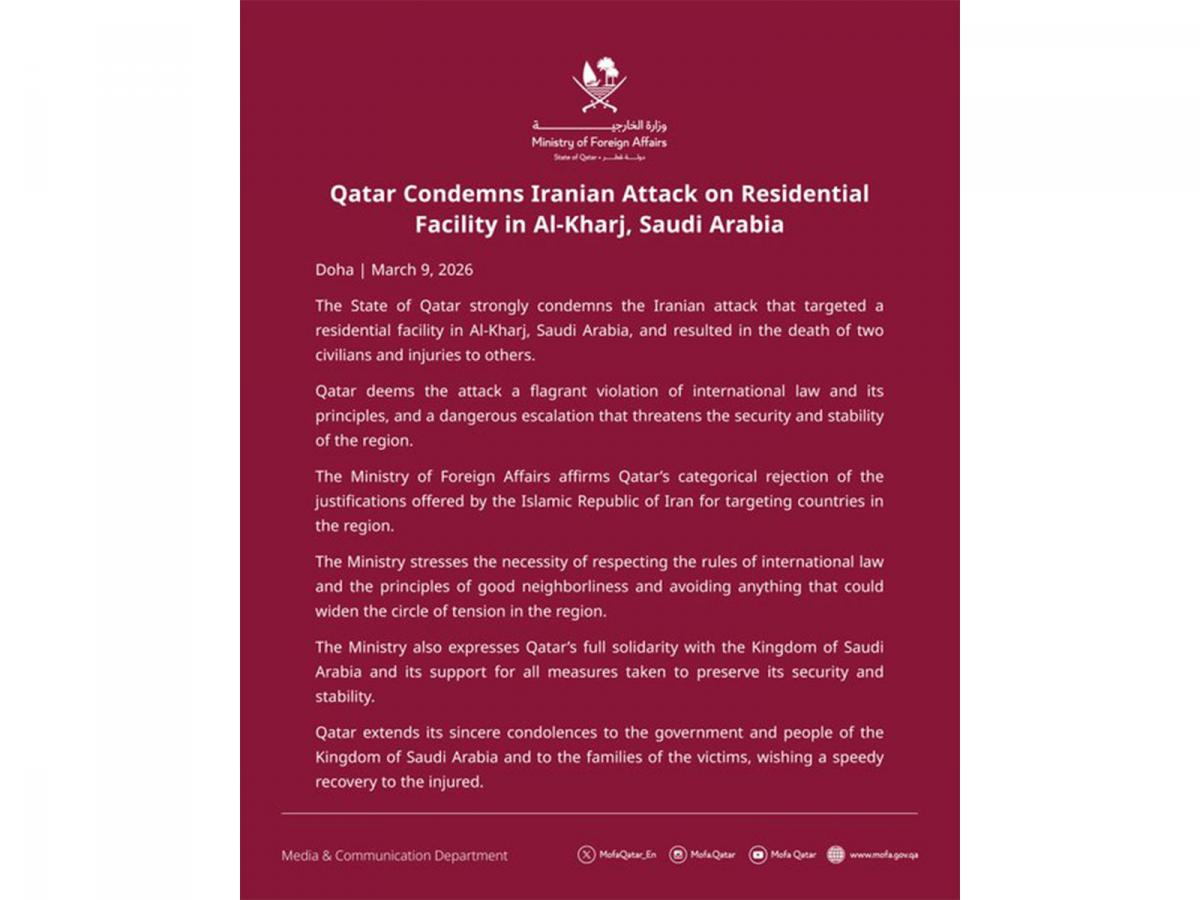 Doha [Qatar], March 9 : The government of Qatar has strongly condemned an attack attributed to Iran that targeted a residential facility in Al-Kharj, a city in Saudi Arabia, resulting in the deaths of two civilians and leaving several others injured.