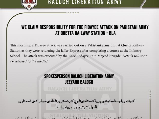 "This morning, a Fidayee attack was carried out on a Pakistani army unit at Quetta Railway Station as they were returning via Jaffer Express after completing a course at the Infantry School. The attack was executed by the BLA’s Fidayee unit, Majeed Brigade. Details will soon be released to the media," BLA said.