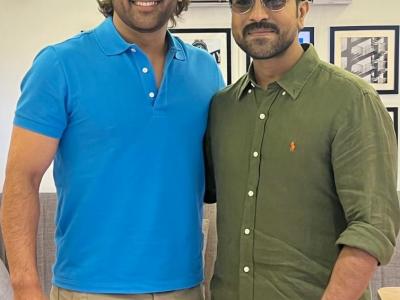 In the photo, Ram Charan is seen attired in a sleek army green shirt and Mahendra Singh Dhoni in a casual blue t-shirt, with both smiling at the camera.