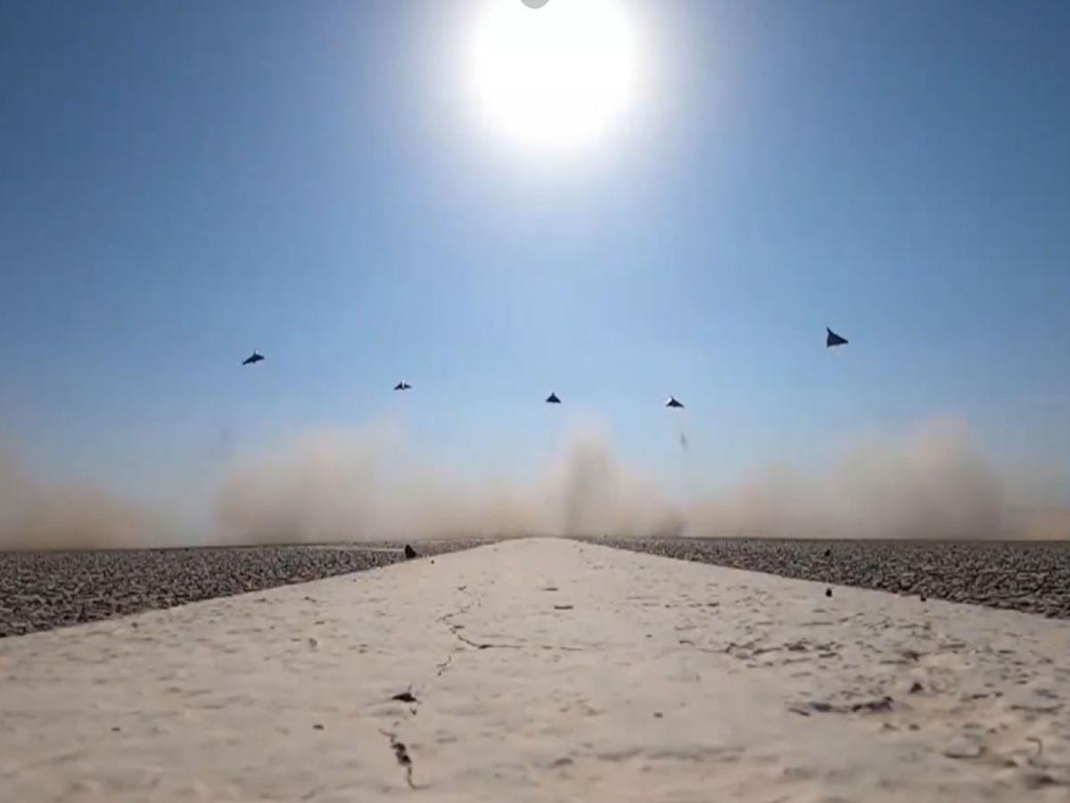The visuals, shared in a post on X and on Telegram by state broadcasters, show several delta-wing drones positioned along a paved runway under a bright sun.