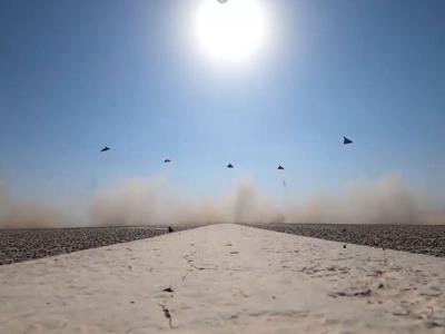 The footage transitions to show the aircraft flying in a tight formation across the horizon, moving away from the launch site as part of the reported "swarm" deployment.