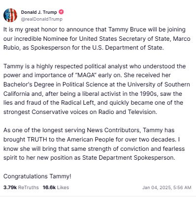 "As one of the longest serving News Contributors, Tammy has brought TRUTH to the American People for over two decades. I know she will bring that same strength of conviction and fearless spirit to her new position as State Department Spokesperson", the post concluded.
