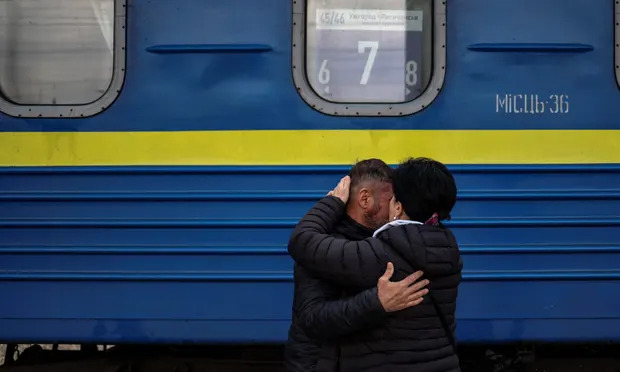 A picture of a Ukraine family has emerged, where a woman gives farewell to relatives as they are about to leave by train at Sloviansk central station.