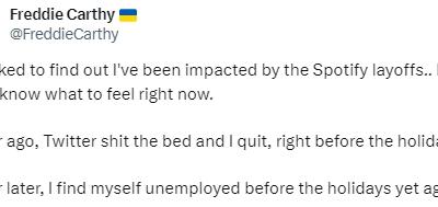 "Shocked to find out I've been impacted by the Spotify layoffs. Don't even know what to feel right now," Carthy posted on X on Monday.