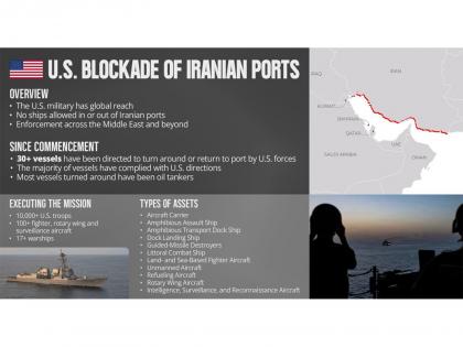 Florida [US], April 23 : United States Central Command (CENTCOM) confirmed on Thursday that American forces "have directed 31 vessels to turn around or return to port as part of the US blockade against Iran". According to military officials, the bulk of these intercepted ships were identified as oil tankers.