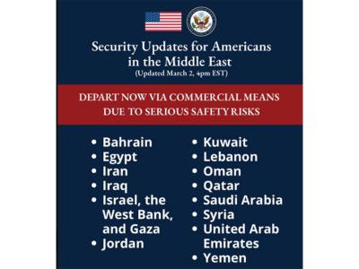 The advisory, updated on March 2 at 4 pm EST, applies to Bahrain, Kuwait, Egypt, Lebanon, Iran, Oman, Iraq, Qatar, Israel, the West Bank and Gaza, Saudi Arabia, Syria, Jordan, the United Arab Emirates, and Yemen.