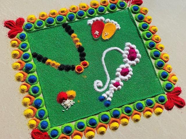 The "Shree" is a symbol for riches, and one of the most simple and auspicious designs is Laxmi Pujan. The symbolic designs can be in floral arrangements or diyas encircled at the center with this very potent image.This would, undoubtedly make it a highly brilliant as well as illuminative in red, orange, yellow colours.
