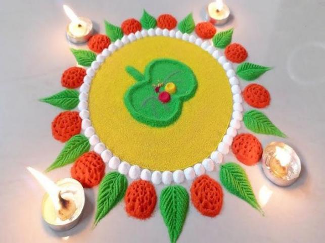 5. With different colors of Rangoli, if you make Apta leaves and marigold flower designs in the Rangoli and decorate it with lamps around it, your Rangoli will look more beautiful.