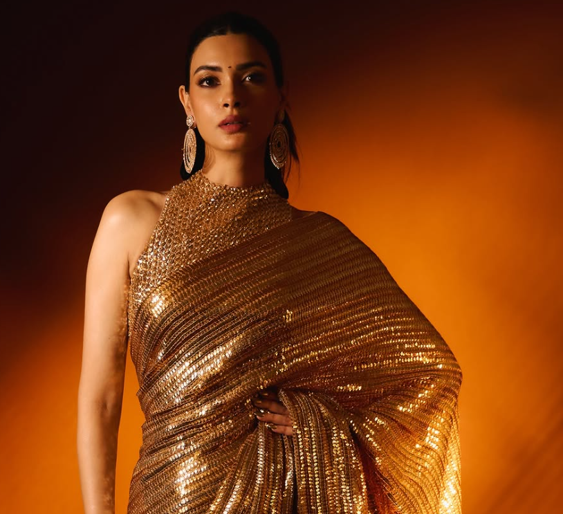Diana Penty redefines old-world glamour in a shimmering gold sequin saree paired with a chic halter-neck blouse from Manish Malhotra. She completes her look with statement earrings that add just the right touch of drama.