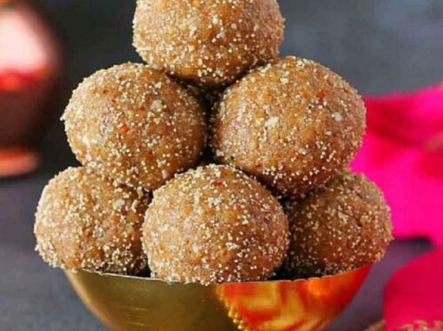 1. Churma Ladoo: Churma Ladoo is a cherished Rajasthani sweet made with ghee, flour, nutmeg, and jaggery, perfect for Prasad.