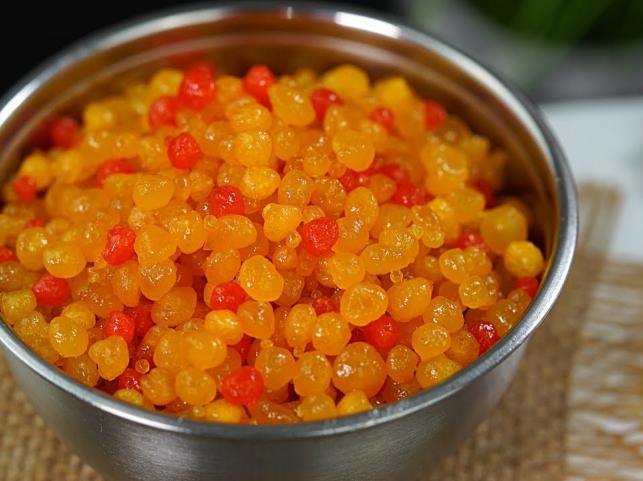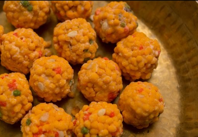 2. Meethi Boondi: Meethi Boondi, a common Prasad item, can be made at home using besan, food colors, and sugar syrup.