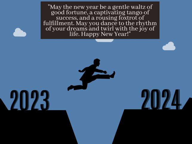 3. "May the new year be a gentle waltz of good fortune, a captivating tango of success, and a rousing foxtrot of fulfillment. May you dance to the rhythm of your dreams and twirl with the joy of life. Happy New Year!"