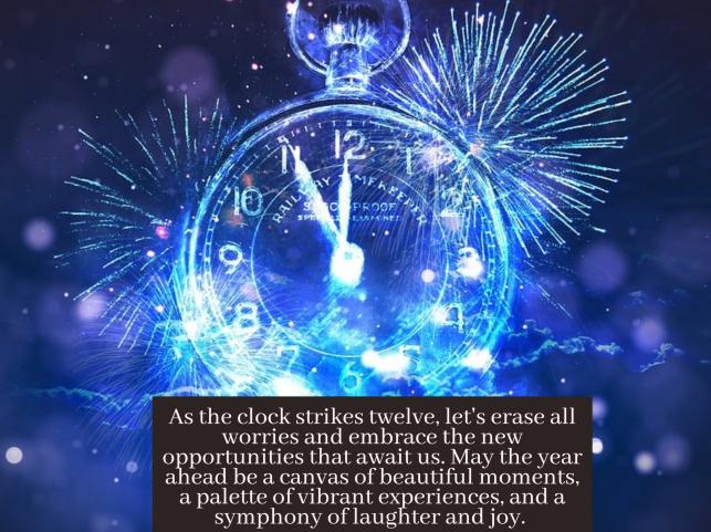2. As the clock strikes twelve, let's erase all worries and embrace the new opportunities that await us. May the year ahead be a canvas of beautiful moments, a palette of vibrant experiences, and a symphony of laughter and joy. Happy New Year!"