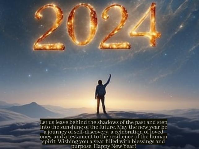 4. Let us leave behind the shadows of the past and step into the sunshine of the future. May the new year be a journey of self-discovery, a celebration of loved ones, and a testament to the resilience of the human spirit. Wishing you a year filled with blessings and purpose. Happy New Year!