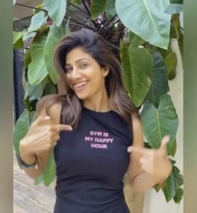 In an Instagram boomerang she shared on Saturday, Shilpa flaunts a T-shirt with the message, "Gym is my happy hour".